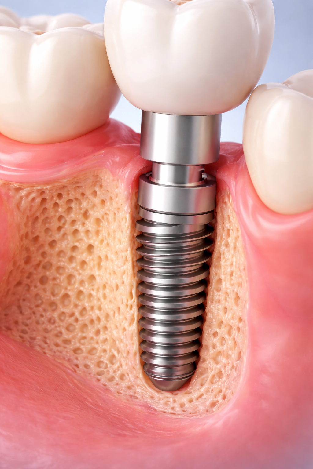 A dental implant is a titanium post that's surgically placed into your jawbone, acting as an artificial tooth root. Once it fuses with the bone — a process called osseointegration that takes 3 to 6 months — a crown is attached on top to look and function exactly like a natural tooth.