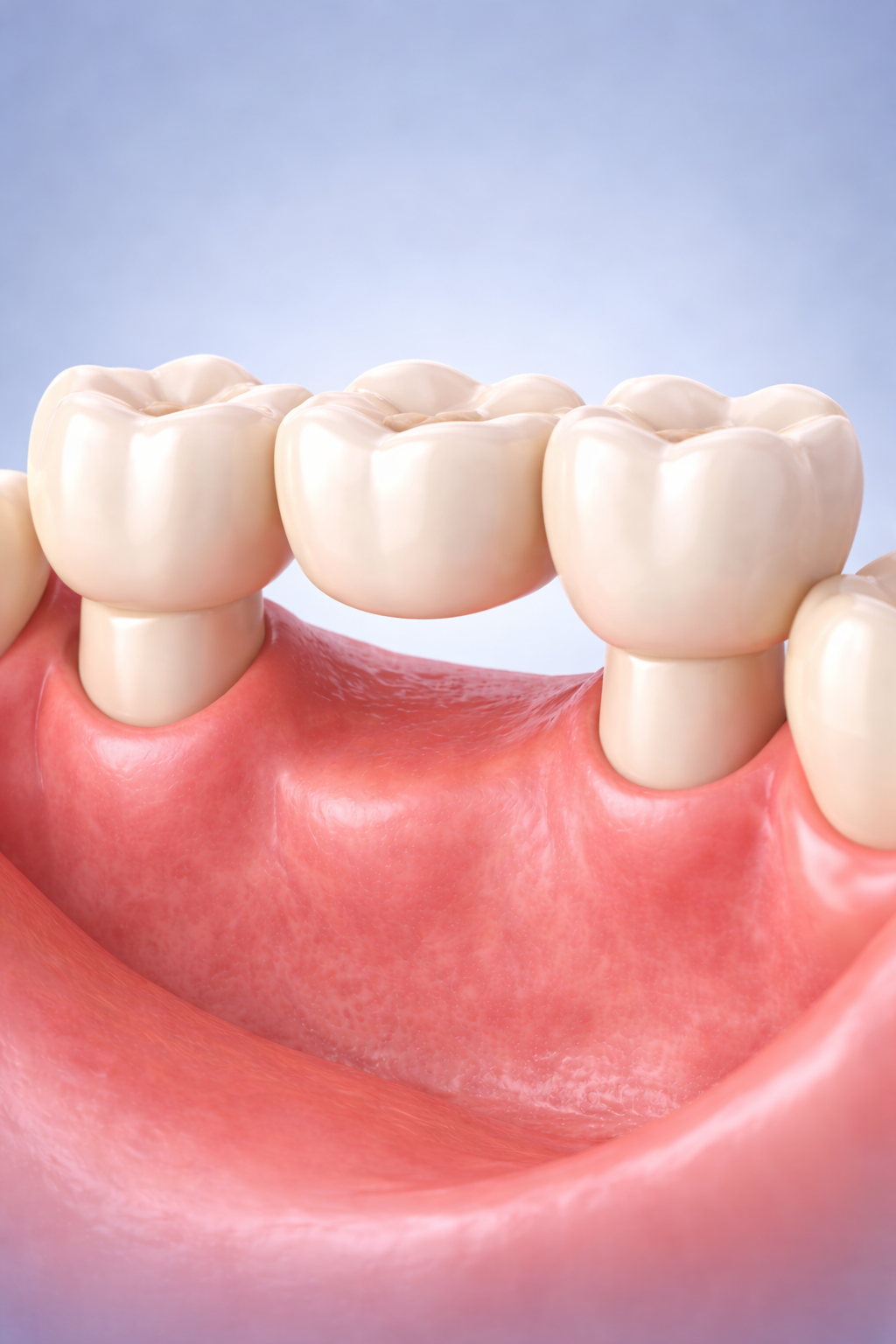 A dental bridge literally bridges the gap left by a missing tooth. It works by crowning the two healthy teeth on either side of the gap — called abutment teeth — and suspending a false tooth (called a pontic) between them. The result is a fixed, non-removable restoration that looks natural and restores your bite.